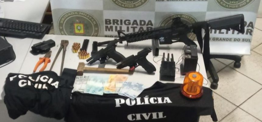 Com os bandidos, foram apreendidos duas pistolas, um carregador, uma réplica de fuzil T4 Airsoft, um bloqueador de sinal, um martelo, um celular, dois alicates torquês, dois televisores, 52 munições intactas e R$ 736. Um dos indivíduos, que apresentava ferimentos de arma de fogo, foi encaminhado ao Hospital Dom João Becker. Nenhum policial ficou ferido.