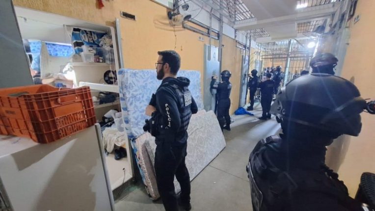 Cinco criminosos foram presos. Os agentes apreenderam 12 celulares e drogas. A operação contou com a participação de 20 policiais civis e 20 penais.