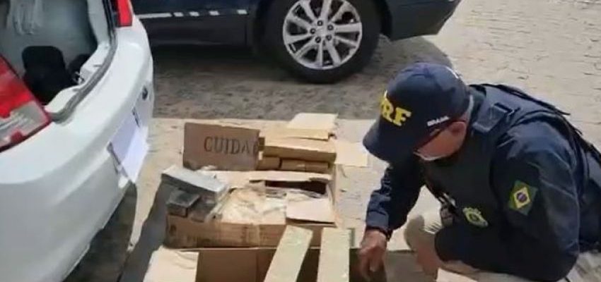 Durante a abordagem os policiais sentiram forte cheiro de maconha e, ao abrirem o porta-malas, encontraram mais de 67 quilos da droga dentro de caixas de papelão.