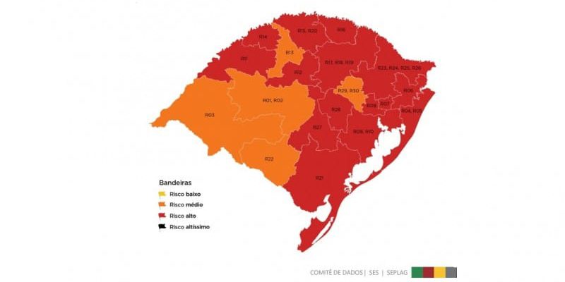 O Governador do Estado atualizou, na tarde desta sexta-feira (10), a cor das bandeiras das 30 regiões que compõem o modelo de distanciamento controlado. A R27, a qual Encruzilhada do Sul está inclusa, passou de bandeira laranja para bandeira vermelha, que representa alto risco. De acordo com o Estado, a região possui alta intensidade de transmissão – muitos casos confirmados na última semana, e alta ocupação de leitos na região. O regramento terá duração de duas semanas, a contar da terça-feira (14).