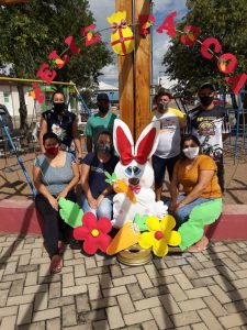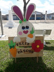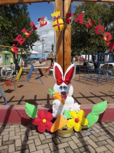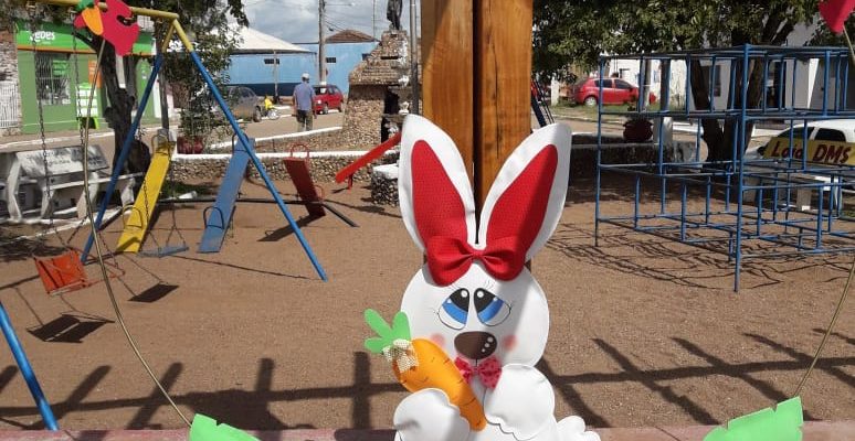 Servidores da secretaria municipal da educação decoram a Praça 4 de Maio com tema de Páscoa, na manhã desta quarta-feira (31).