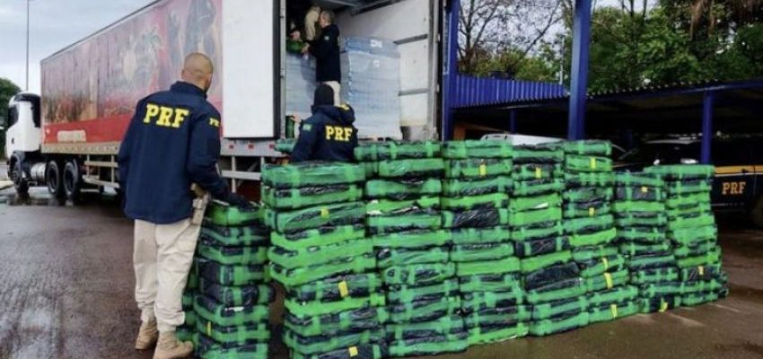 Dentro da câmara fria do veículo os policiais encontraram fardos de maconha escondidos entre os paletes de congelados. A carga foi estimada em mais de 1,1 tonelada. Fiscais do MAPA deram apoio na verificação da carga.