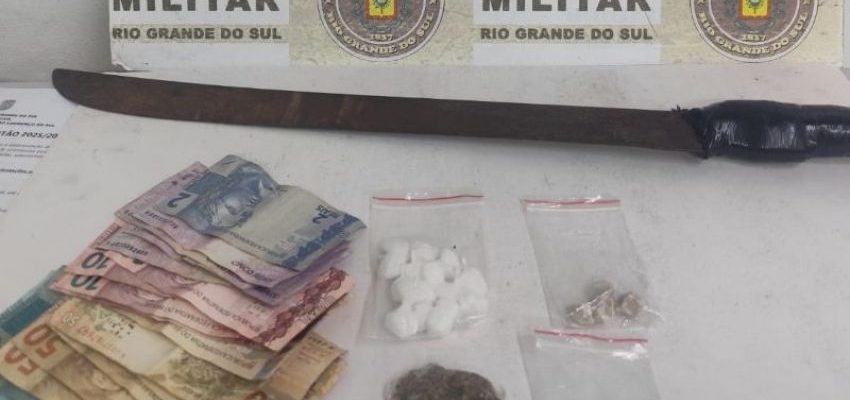 Conforme a corporação, os policiais localizaram os suspeitos e realizaram a abordagem. Durante a revista pessoal, foram encontradas porções de maconha, cocaína e crack, além de comprimidos de ecstasy, dinheiro e uma arma branca. Segundo a Brigada Militar, os materiais estavam fracionados e prontos para comercialização.