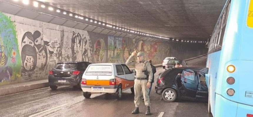 Na manhã desta sexta-feira (3), um veículo Celta perdeu o controle e colidiu com a lateral de um ônibus no túnel Conceição em Porto Alegre.