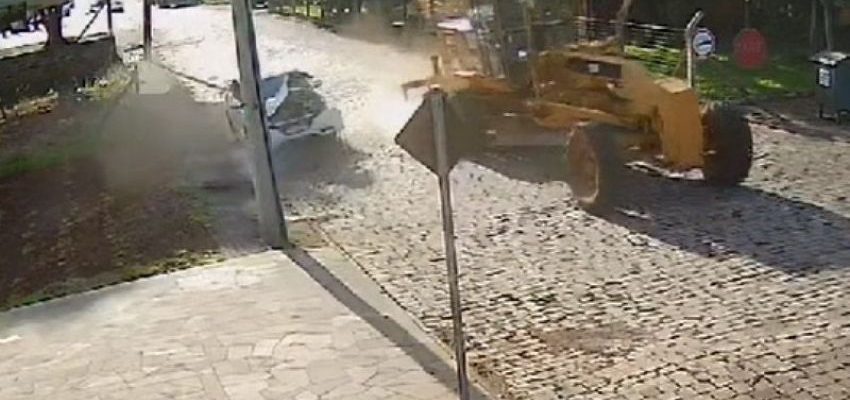 Um vídeo que está viralizando nas redes sociais captou o exato momento que o pneu de uma patrola explodiu e acabou destruindo a parte dianteira de um carro no município de Casca, na Região Norte do Rio Grande do Sul.